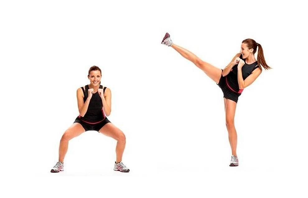- Перенесите вес тела на опорную ногу, скрутите корпус и сделайте резкий кик (удар).