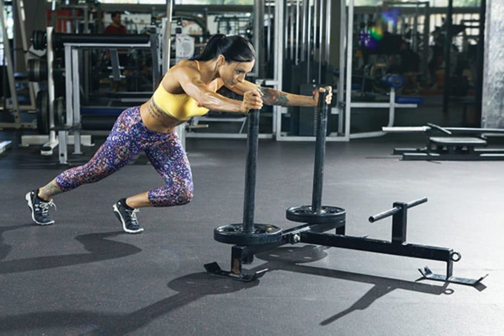 - Prowler push: делайте длинные, медленные, продуманные шаги с умеренными рабочими весами на «санках».