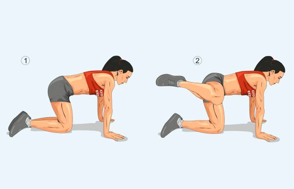 Это упражнение можно делать как с резинкой (на уровне коленей), так и без. Примите положение на четвереньках, спину держите ровной, втяните живот. Максимально отведите ногу в сторону на выдохе. В верхней точке старайтесь сделать паузу или пружинить. На вдохе медленно опустите ногу.