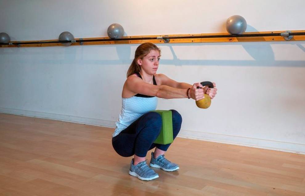 Встаньте, расставив ноги на ширине бедер. Поместите между коленями валик, мяч или другой подручный предмет. Сохраняя вес на пятках, слегка выдвиньте колени вперед и глубоко присядьте. Держите противовес перед собой, руки параллельны полу. Задержитесь в приседе от 30 секунд до минуты, а затем примите исходное положение.
