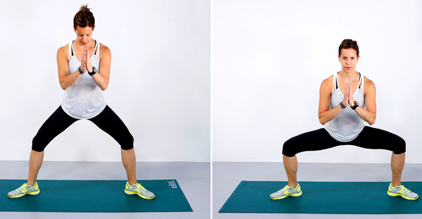 Это более сложный вид приседаний, который совершается с широко расставленными ногами и развернутыми стопами. Необходимо не только следить за техникой выполнения, но и держать баланс. Одно из лучших упражнений для похудения в бедрах.