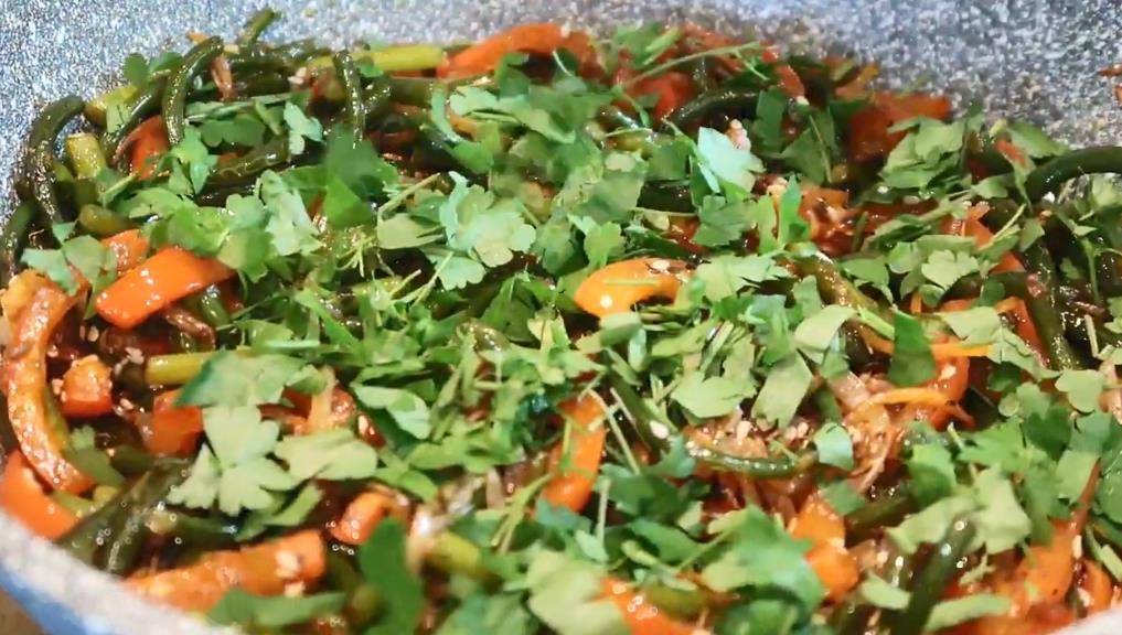Полить овощную поджарку соевым соусом, протушить 5 минут. В конце тушения посыпать специями, кунжутом и мелко нарубленной зеленью.