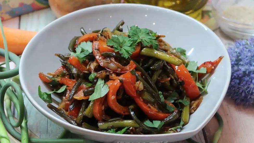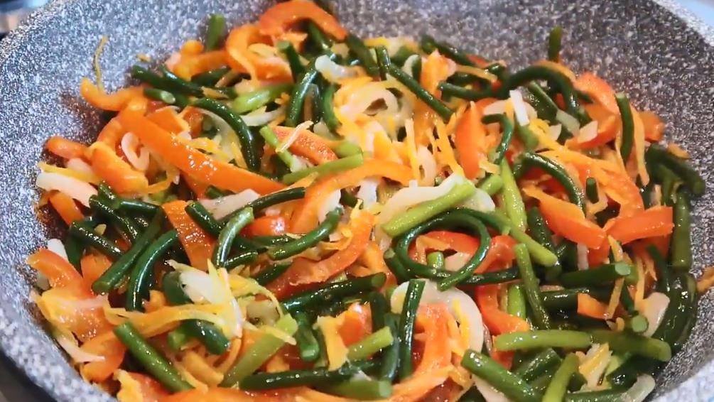 Очистить перец от семян и прожилок, нашинковать соломкой. Раскалить в глубокой сковороде растительное масло, обжарить стрелки и подготовленные овощи до мягкости.
