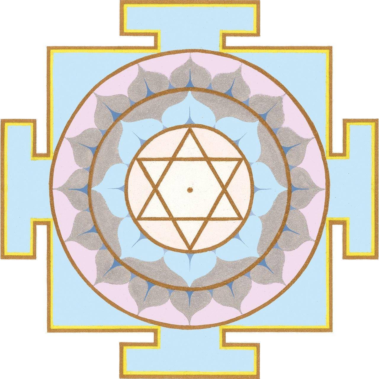 Шри Янтра – сакральная геометрическая модель, используемая мудрецами в йоге, чтобы разгадать тайны Вселенной. Она характеризуется девять взаимосвязанными треугольниками, исходящими из одной центральной точки. Четыре прямых треугольника представляют собой мужскую сторону (Шива) и пять перевернутых треугольников – женскую сторону (Шакти) – Божественную Мать.