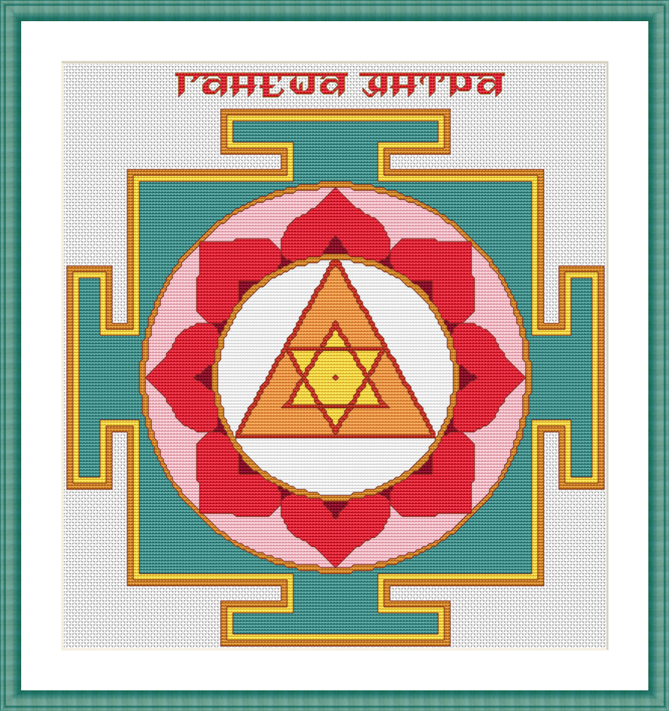 Красный лотос (огонь), помещенный в круг, связан с манипурой и чакрой солнечного сплетения. Янтра создается из центральной точки «Бинду» (семя мира) – это истинные знания и благосостояние. Треугольные орнаменты расширяют пространство, также как все живое вырастает из небытия. Выступы в виде буквы «Т» у квадратов (бхупуров) означают очищение души от материального и выходы в иное пространство.