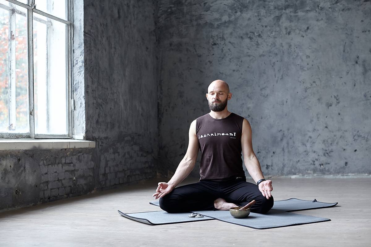 Техника: Сядьте на землю, вытянув ноги вперед. Затем положите правую стопу на внутреннюю часть левого бедра и левую стопу на внутреннюю часть правого бедра. Положите руки на коленные суставы.