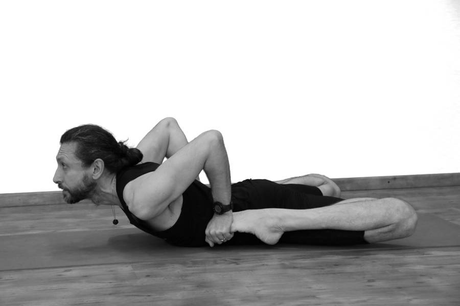 Если вам трудно захватить руками обе стопы одновременно, подготовительная версия может оказаться полезной. Лежа на животе, приподнимите верхнюю часть тела, словно хотите войти в позу Сфинкса или Бхуджангасану на локтях. Расположите левую руку пред собой так, чтобы предплечье было направлено вперед, а локоть находился под плечом. Согните правое колено и захватите верхнюю часть стопы правой рукой; если сможете, направляйте пальцы руки вперед. Дышите, на вдохе увеличивая вытяжение в ноге и верхней части тела и слегка расслабляясь на выдохе. Оставайтесь в этом положении пять вдохов-выдохов, затем поменяйте стороны. Затем выходите из позы также, как из полной версии Бхекасаны.