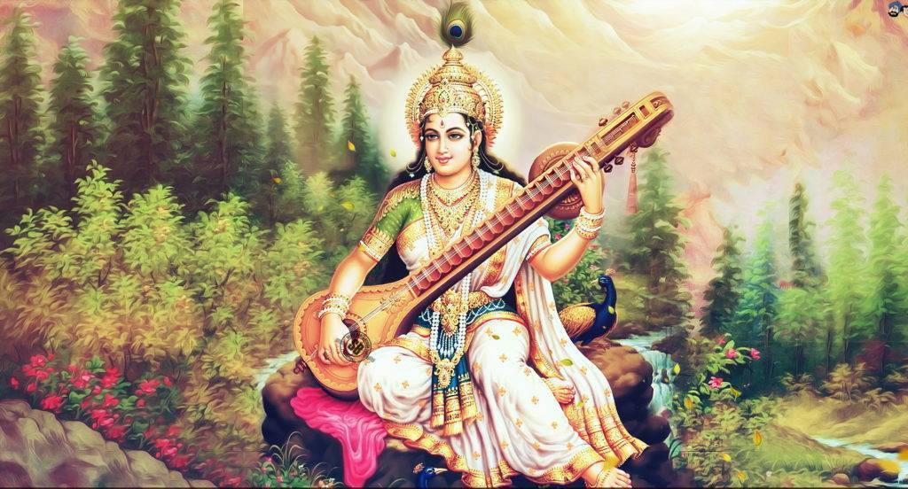 У богини несколько имен. Она и Шарада, дающая существование, и Брахми, жена бога Брахмы, и Вагишвари, богиня речи, и др.