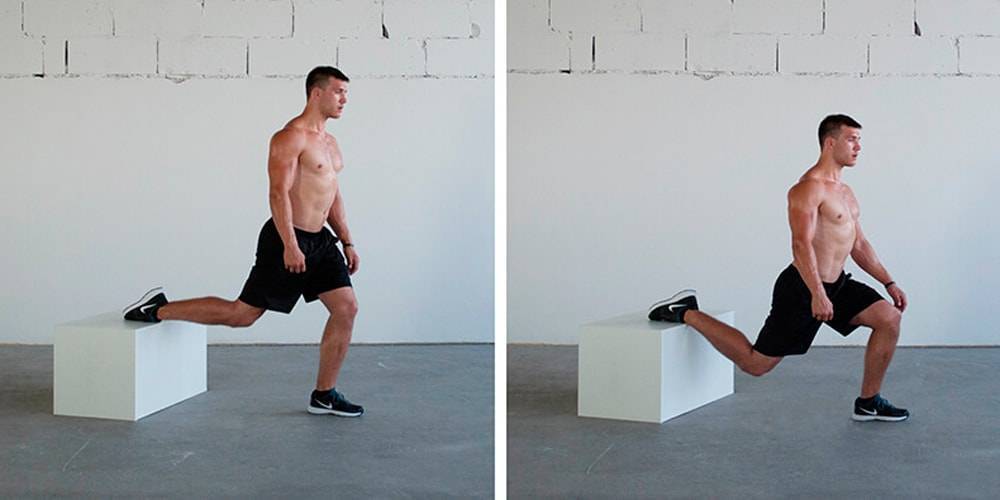 Утяжелённый вариант упражнения. Задняя нога находится не на полу, а на возвышенной опоре и на переднюю ногу приходится большая часть веса тела.