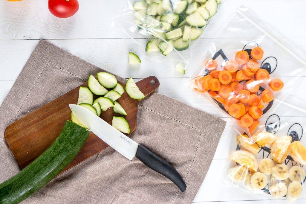- Кусочки овощей. Очень удобно для дальнейшего использования многих блюд. Вымойте хорошо овощи, какие хотите, порежьте кусочками и отправьте в пакеты для заморозки. Можете сразу сделать отдельные заготовки нескольких овощей для какого-то блюда. А потом просто доставайте и закидывайте.