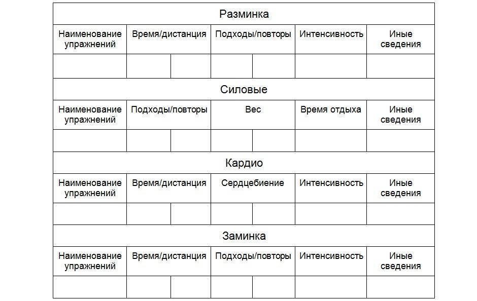 Что касается нашего предпочтения, если кому-то интересно, то мы отдаем бумажному виду, шаблон которого вы увидите ниже. В нем нет ничего лишнего, все только самое нужное, без отвлечения атлета от тренировочного процесса.