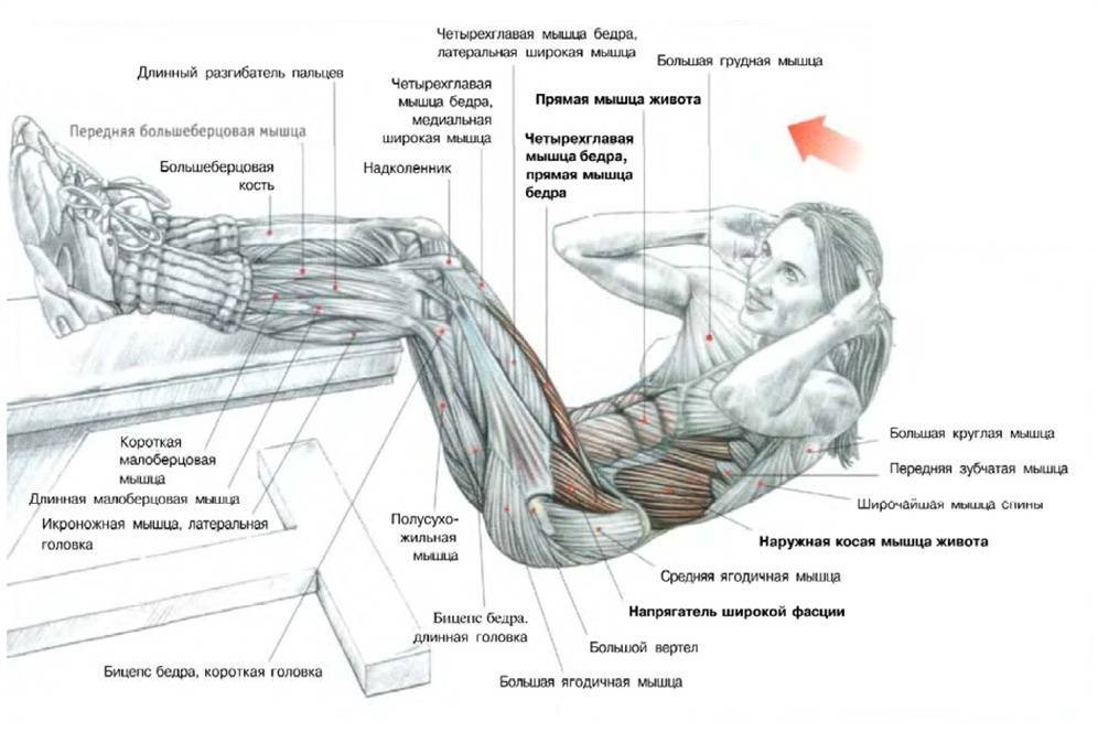 Самая популярная ошибка, десятилетиями насаждалась в спортивных кружках, на физкультуре, и даже в современных тренажерных залах. Это амплитуда движения! Техника скручиваний на наклонной скамье не подразумевает полного подъема корпуса! Не нужно держать спину ровной! Как следует из названия упражнения – это скручивания, а не подъем корпуса. Амплитуда, должна быть очень небольшой! Но почему? Ведь десятилетиями пресс качали намного сложнее, с полным подъемом корпуса, что казалось намного тяжелее. Все очень просто, если держать спину ровной, большую часть нагрузки съедает не мышцы пресса. В большинстве случаев они вообще отключаются. Вместо этого нагрузка ложится на: