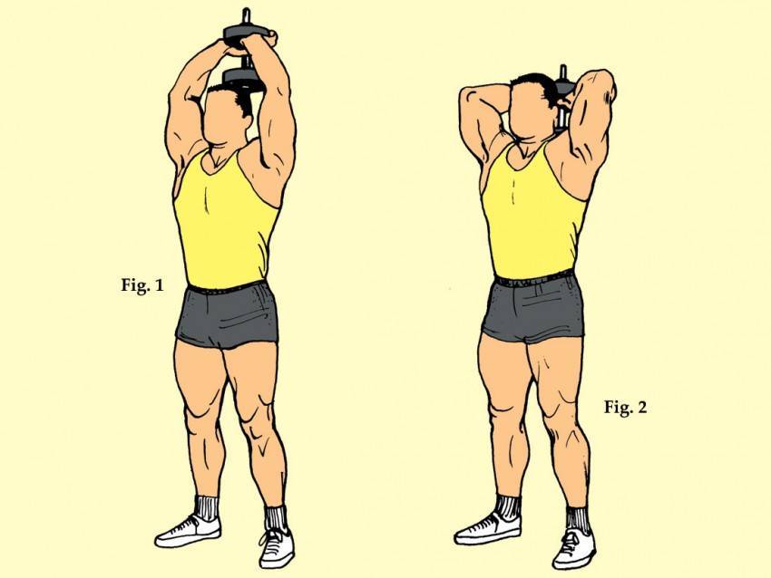 Встав в исходную позицию, плечи прижимаются к голове, а гантель берется за головой при помощи двух рук, расположенных параллельно друг по отношению к другу.