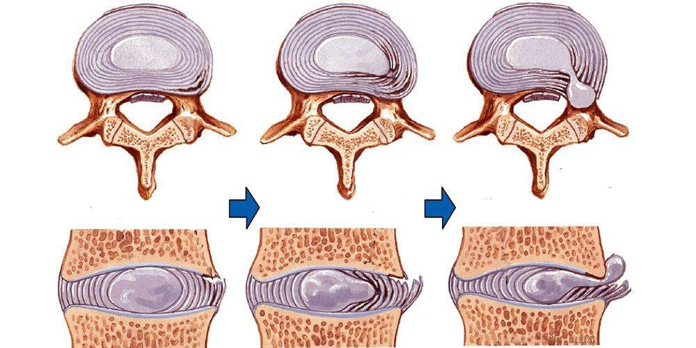 В результате формируются предпосылки для смещения части пульпозного ядра в большей или меньшей степени ближе к границам диска. Фиброзное кольцо испытывает серьезную перегрузку (она может достигать 150–300 кг) и все больше сдавливается студенистым содержимым диска. Это приводит к постепенному разрушению образующих фиброзную оболочку волокон и, как следствие, уменьшению ее толщины. В результате пульпозное ядро проникает в образовавшийся зазор, что и называют протрузией. Диск в таком состоянии может незначительно выпячиваться за границы позвоночника, что в отдельных случаях способно тут же привести к ущемлению спинномозговых корешков.