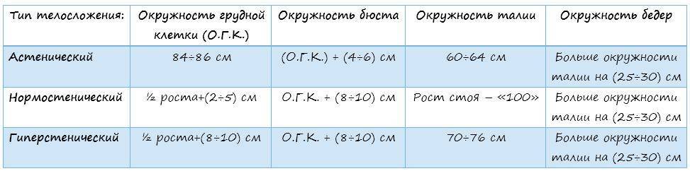 - гиперстенический тип фигуры считает идеальным грудь при соотношении 1/2 больше роста на 10 см. Талия от 70- до 75.