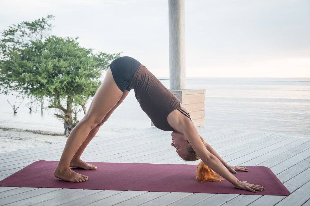 - Адхо Мукха Шванасана. Эта асана требует перемещения веса всей верхней половины тела только на руки, в результате чего можно быстро укрепить бицепсы и избавиться от лишних килограмм. При этом надо соблюдать спокойное и ровное дыхание.