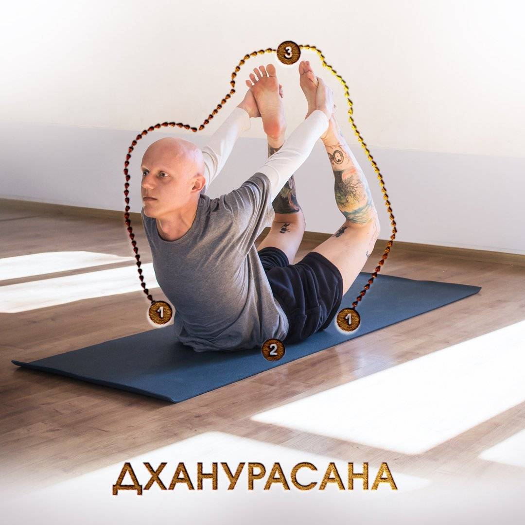 Йогин лежит на животе, уперевшись подбородком в пол. Ноги подгибаются, чтобы стопы приблизились к ягодицам. Корпус прогибается, руки обхватывают лодыжки. Бедра и грудь приподняты от пола. Трех подходов по 20 секунд будет достаточно.