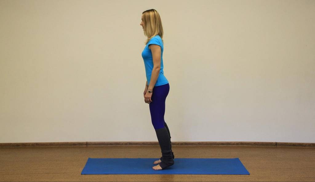 - Встаньте на коврик, спина прямая, макушкой тянемся вверх.