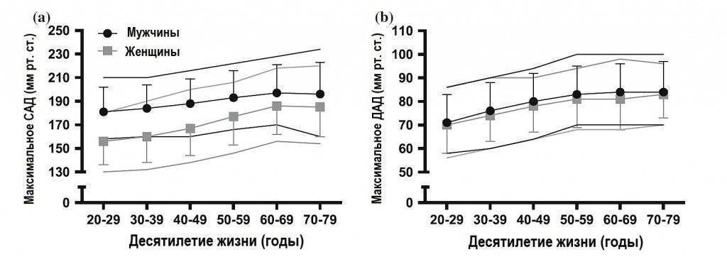 Как упоминалось выше, характеристики фенотипа человека влияют на максимальное САД, полученное в КНТ. В большой группе здоровых людей у мужчин максимальное САД было выше, чем у женщин, а у пожилых людей выше, чем у более молодых (Рис. 3) (43). Также максимальное САД выше у тренированных людей, чем у их малоподвижных сверстников (23, 44), у людей с гипертонией, чем у нормотонических (25, 26) и у людей с пониженной чувствительностью к барорефлексу (27). ACSM и АНА рекомендуют прекращать КНТ при САД и ДАД, превышающим 250 и 115 мм рт. ст., соответственно (3, 45). Этот критерий не изменяется десятилетиями (46), начиная с исследования, представленного на Рис. 1 (4), где авторы рекомендовали без обоснования: «… Нагрузочное тестирование нужно завершить, если САД превысит 250 мм рт. ст.». Аналогично неизвестны основания для критерия ДАД и связь этих верхних значений АД с увеличением негативных явлений при физической нагрузке (19).