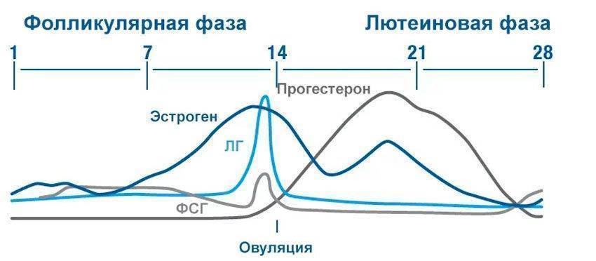 В некоторых источниках встречается такое название гормона, как эстрадиол. Он представляет собой основной гормон эстрогеновой группы и вырабатывается на репродуктивной фазе. ФСГ или фолликулостимулирующий гормон отвечает за выработку фолликулы, а ЛГ или лютеинизирующий — отвечает за начало овуляции и регулировании секреции прогестерона. Продолжительность фолликулярной фазы составляет около двух недель, то есть не заканчивается с завершением критических дней.
