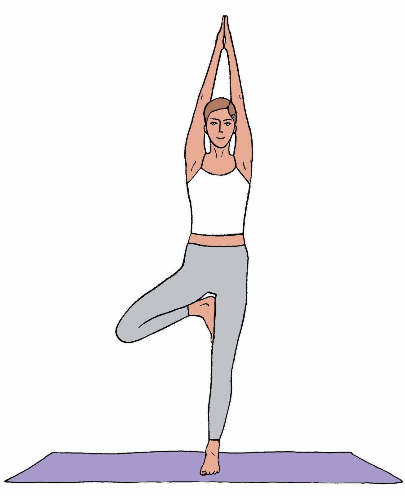 Становимся, ноги ставим вместе, руки по максимуму поднимаем ровно над головой и складываем ладонями внутрь. Одна нога поднимется, сгибается в коленном суставе и ставится на ногу, которая служит опорой. Так нужно простоять в течение нескольких секунд. Это же делаем и другой ногой.
