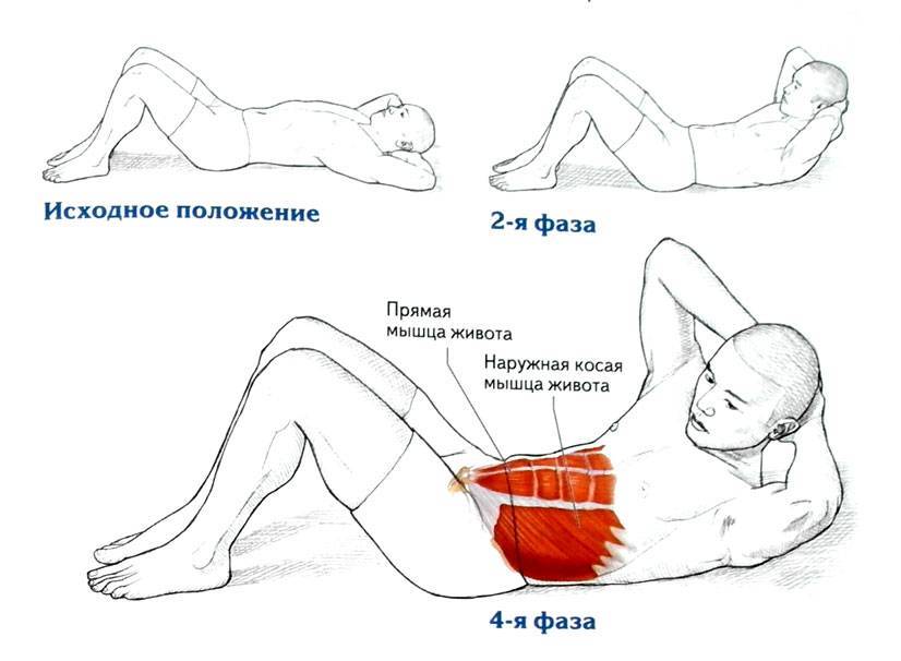 Расположившись полулежа на данном снаряде — так, чтобы мяч находился под поясницей, поднять бедра на один уровень со спиной. Колени согнуть, развести на ширину плеч, стопы прижать к поверхности под снарядом. Руки убрать за голову. На выдохе поднимать верхнюю часть тела, на вдохе — опускать