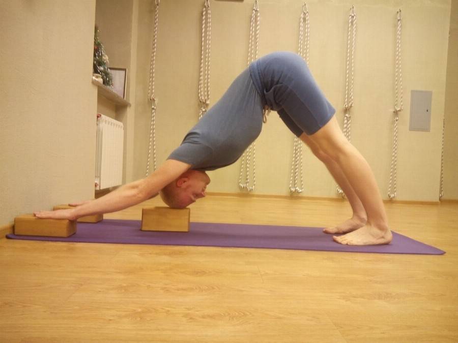 Чтобы правильно входить в асану, если у вас нет практики, можно взять деревянные бруски и поставить их к стене. На них мы будем опирать руки, это позволит с меньшей нагрузкой на плечи корректно войти в позу.