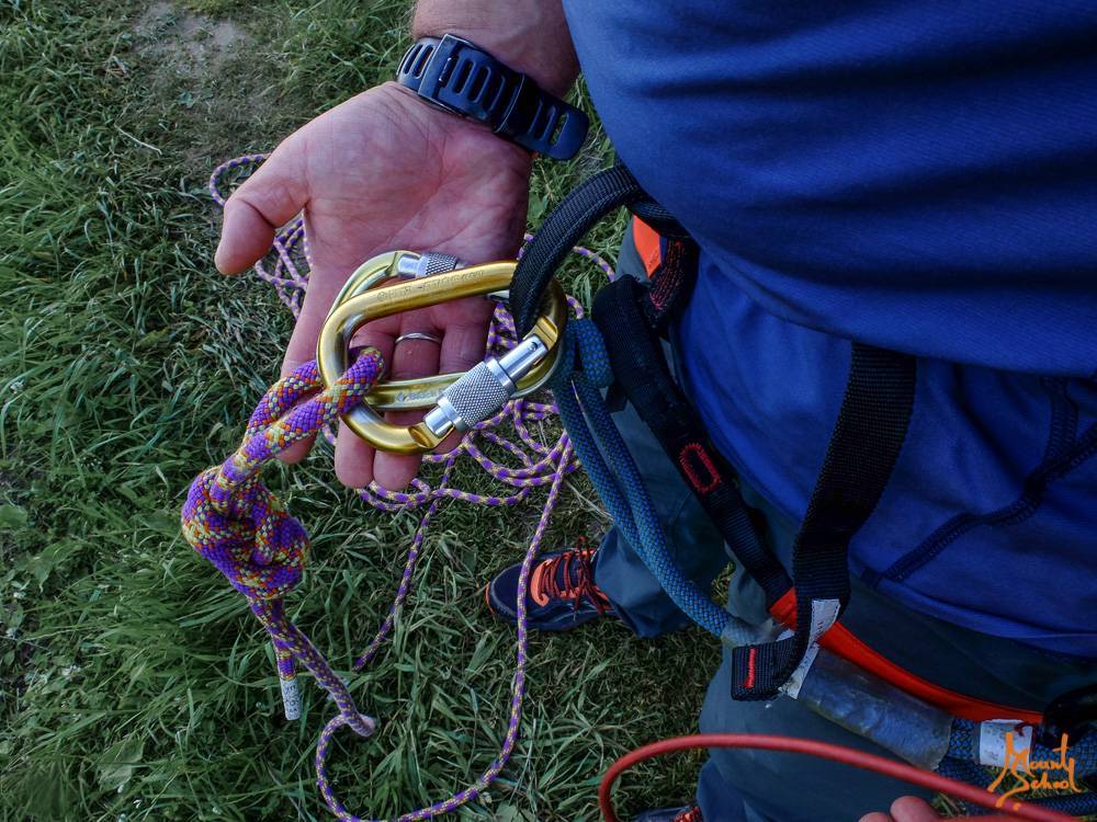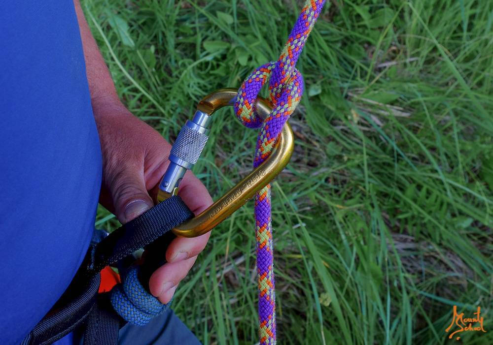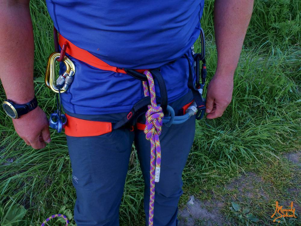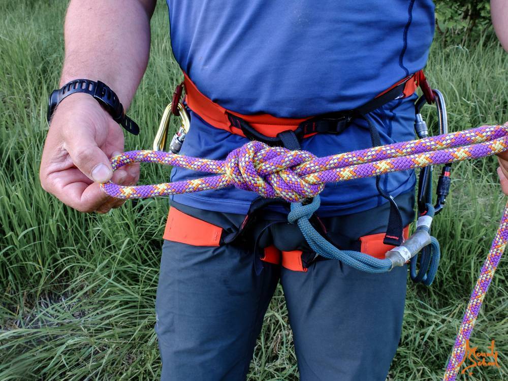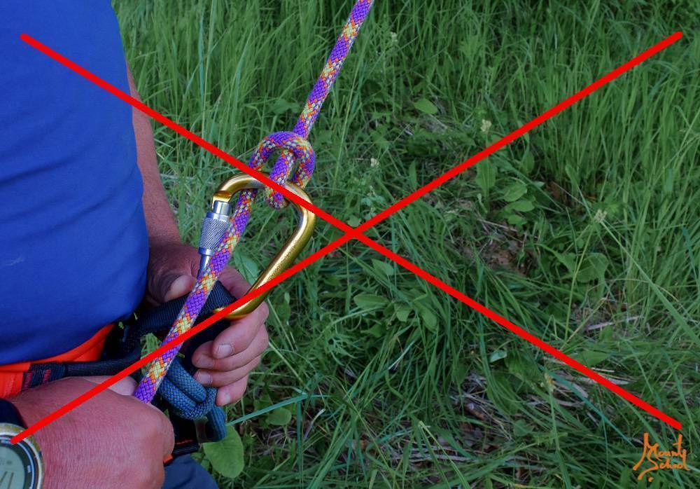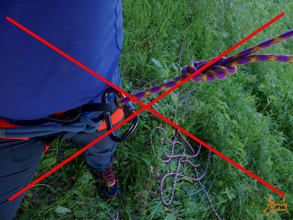 В одном метре от конца веревки завязывается узел, который предотвратит потерю страховки, если веревка окажется слишком короткой. Рекомендованный узел – половина узла грейпвайн.