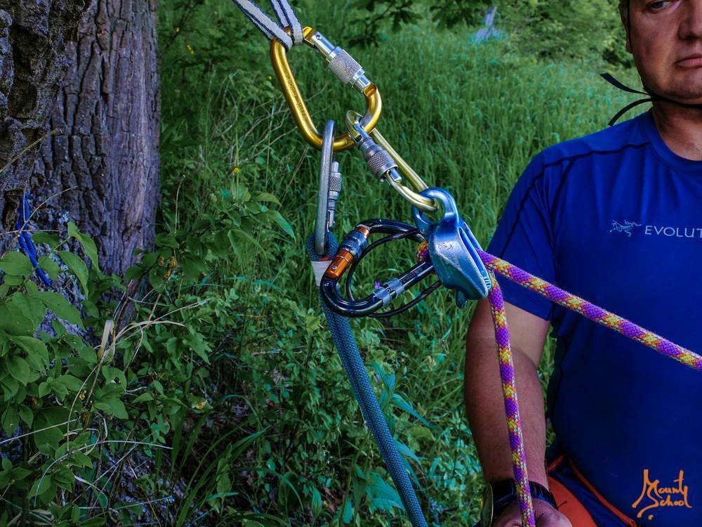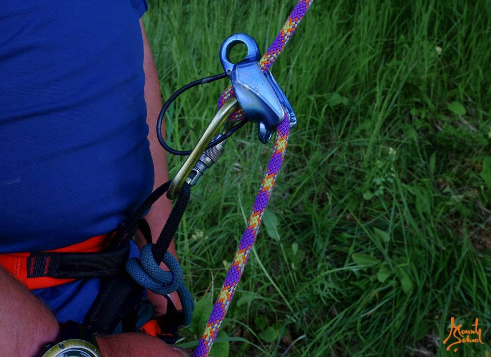 Устройство крепится к страховочной станции, и в него заправляется веревка, как показано на фотографии. СУ и веревка в СУ крепятся с помощью муфтованных карабинов.