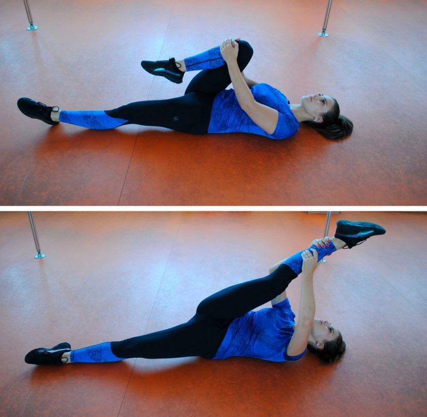 - Выпрямите ногу и тяните к голове 30 секунд.
