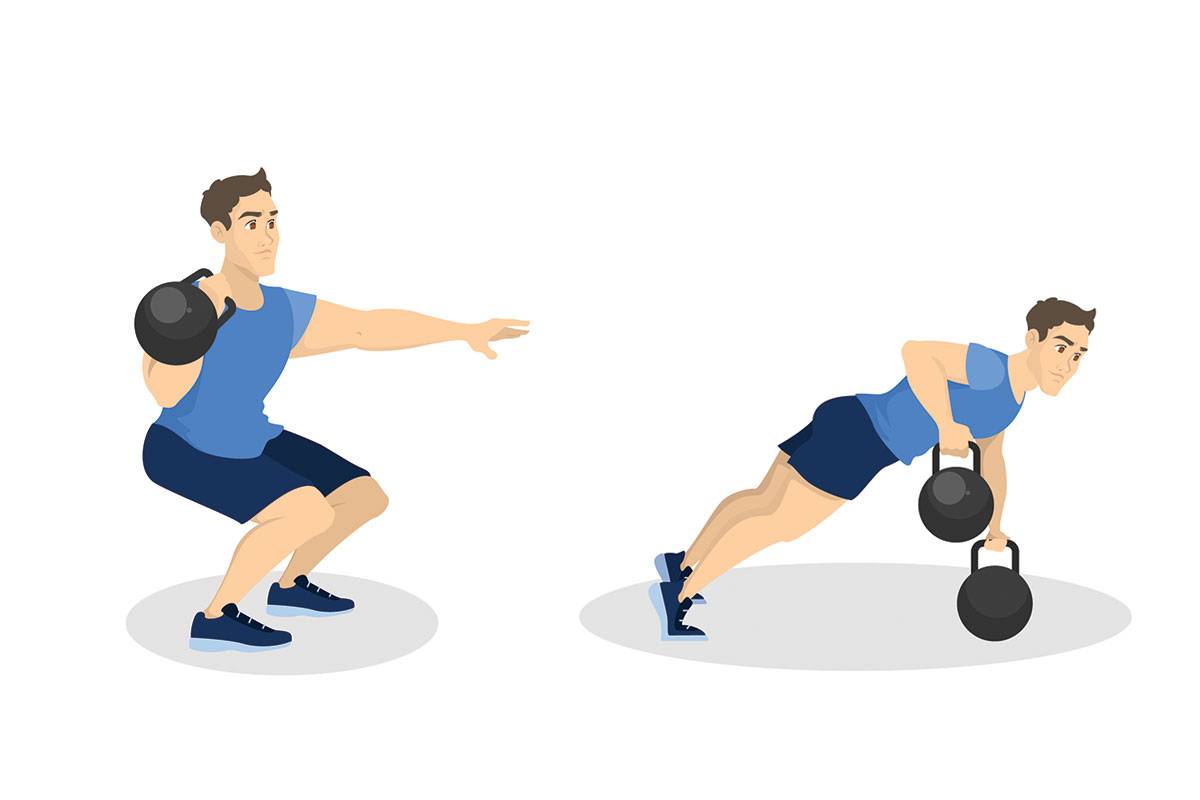 - Силовая часть: за 15 минут выполнить как можно больше циклов — 30 прыжков на скакалке, 10 выжиманий гири вверх, 10 подъемов ног в висе, 10 гиперэкстензий, 10 отжиманий с гирей.