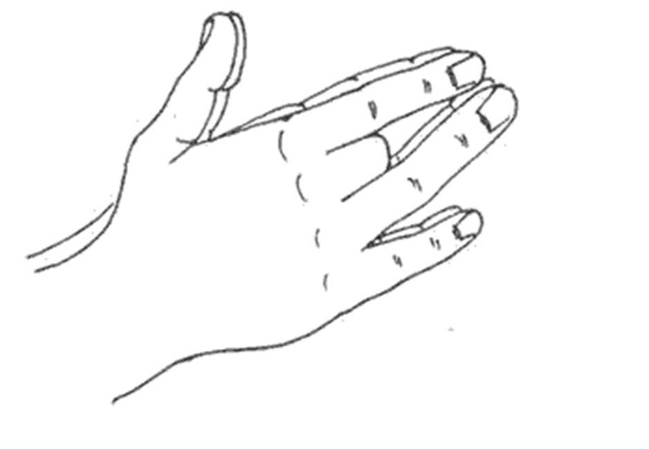 Соедините подушечки указательного, безымянного и большого пальцев. Остальные пальцы должны быть выпрямлены. Пальцы держите без напряжения.