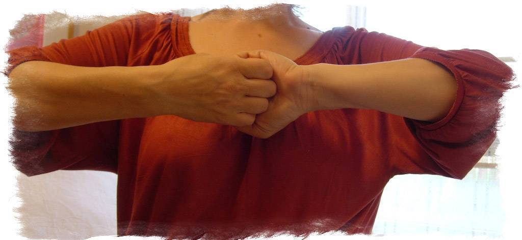 Правила выполнения: правую руку расположите напротив грудной клетки, ладонь должна смотреть вперед. Пальцы слегка согните. Точно также расположите и левую, только теперь ладонью к себе.
