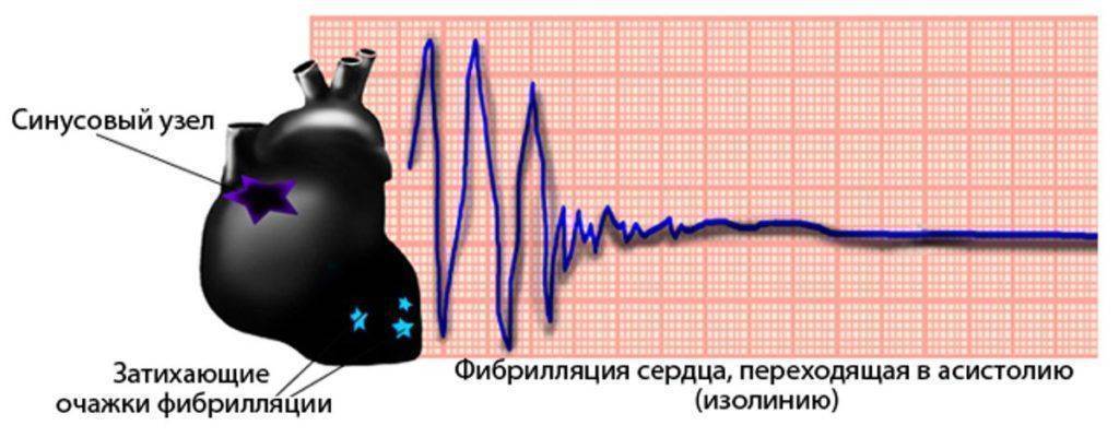 - кардиогенному шоку – становится следствием резкого падения кровяного давления в ответ на замедление сердечного ритма (вероятность смерти составляет 90%);