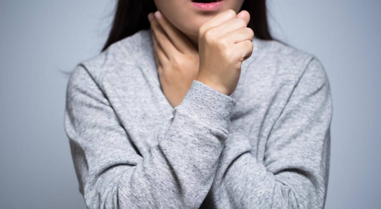 Анестезия. Симптомы – снижается, либо полностью исчезает чувствительность в области горла, человек испытывает затруднения при глотании слюны или пищи, присутствует напряжение в районе грудины, ключиц и гортани. Неврологическая реакция соответствует реакции, которая бывает при истерике. У пациента затрудняется процесс глотания, наблюдается дефицит воздуха, он пытается вдохнуть побольше кислорода, широко открывая рот.
