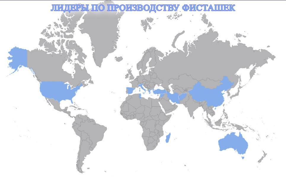– В наибольших количествах фисташки выращивают в Иране и США, а также в Турции, Сирии, Китае, Греции, Афганистане, Тунисе и Италии. А также фисташки растут на Кавказе и в Крыму.