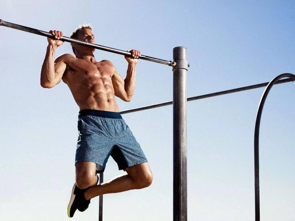 - Атлет висит на турнике. Руки его расположены достаточно близко друг к другу, но не чрезмерно.