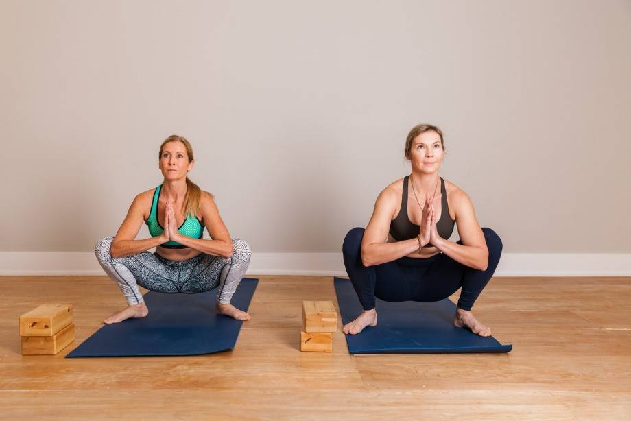 - Асана начинается с приседания. Сядьте на корточки, чтобы упор приходился на пальцы ног.
