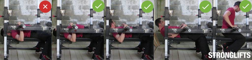 Сохраняя лопатки сведенными вместе, выставьте грудь вперед. Для этого, сохраняя ягодицы прижатыми к скамье, прогните нижнюю часть спины и выкрутите грудную клетку вверх. Это растянет грудные мышцы, увеличивая таким образом амплитуду движения и повышая эффективность упражнения. Однако не выгибайтесь слишком сильно.