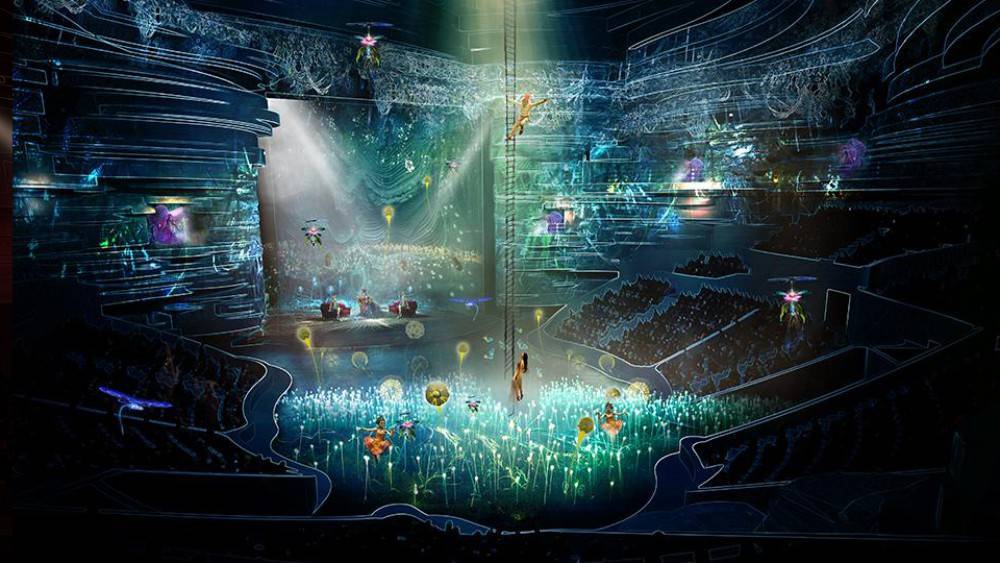 Чтобы подогреть воображение зрителей, на полу и стенах появляются 3D-проекции, а мощная аудиосистема распространяет звук на 360 градусов, создавая потрясающий эффект. Изюминка шоу – это большая аквасцена, которая наполнена 2,7 млн литров воды. И в считанные мгновения она может перевоплотиться в сухую сцену для выступления.