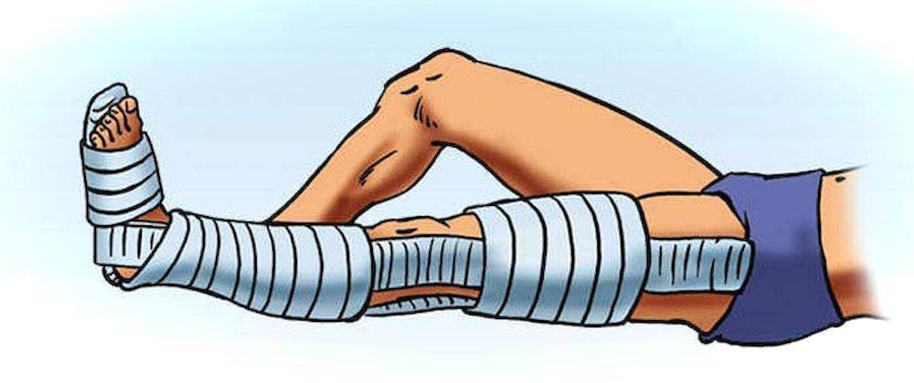 Перелом голени требует немедленной иммобилизации поврежденного органа. Удобнее сделать шину Крамера из подручных материалов, которую моделируют в соответствии с формой ноги, помещая внутрь сложенную в несколько слоев ткань для амортизации движения. Шину необходимо накладывать по всей задней поверхности ноги, начиная от подъягодичной складки, заканчивая пяткой, затем загнуть и обеспечить неподвижность всей стопы. Для более прочной фиксации желательно использовать дополнительные боковые шины из фанеры по обеим сторонам травмированной ноги. Их необходимо аккуратно прибинтовать к конечности.