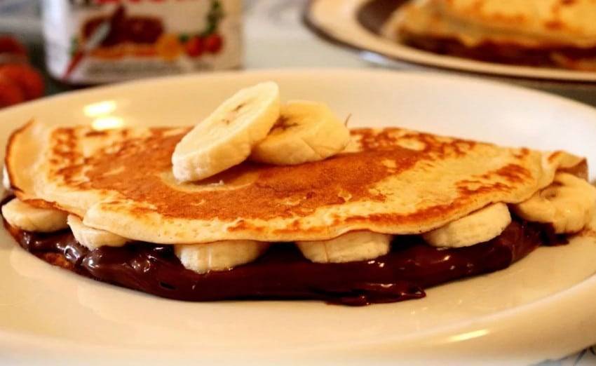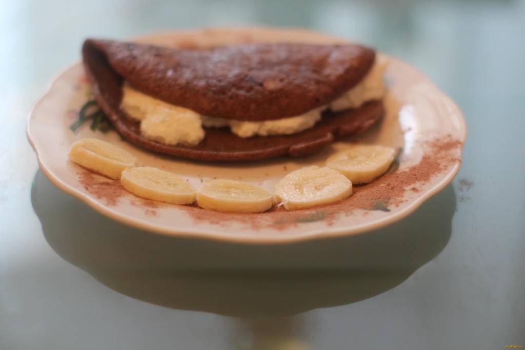 Вам понадобятся какао, банан и пачка мягкого творога. Смешайте все ингредиенты в блендере до консистенции пюре. Смажьте блин и наслаждайтесь.