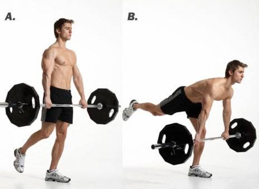 Колен рабочей ноги чуть согнуто, свободной – прямое; Важно не тянуть гриф руками, поэтому требуется использовать достаточно существенный вес для того, чтобы упражнение выполнялось правильно. Журавлик или румынская тяга на одной ноге