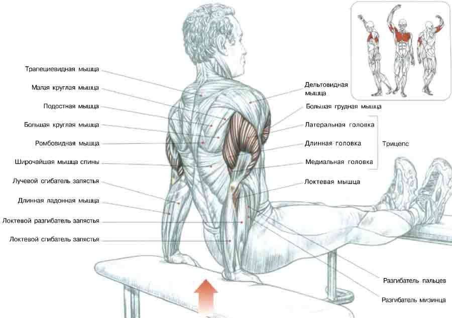 Обратные отжимания рекомендуется выполнять с большим числом повторений – от 15 до 20 раз в 3-4 подхода.