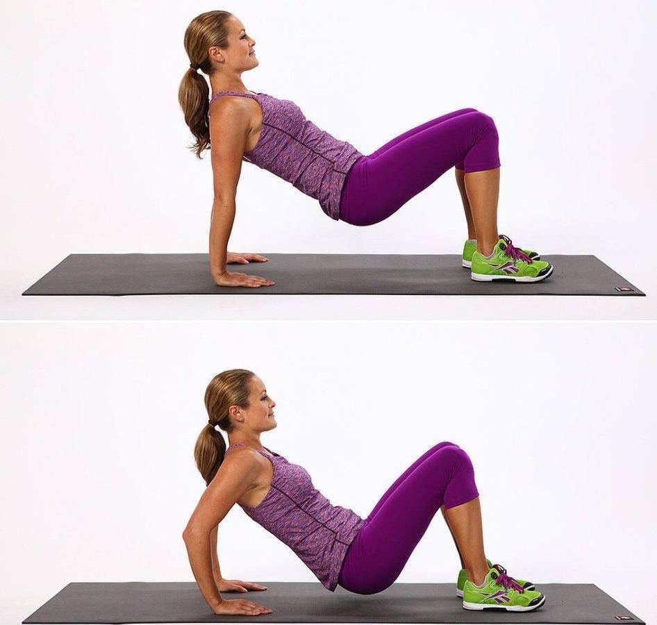 сидя на полу, колени согнуты, ступни на ширине плеч и прижаты к полу. Руки поставьте позади себя чуть шире плеч. Поднимите таз, опираясь на ноги и руки, чтобы тело образовывало прямую линию.
