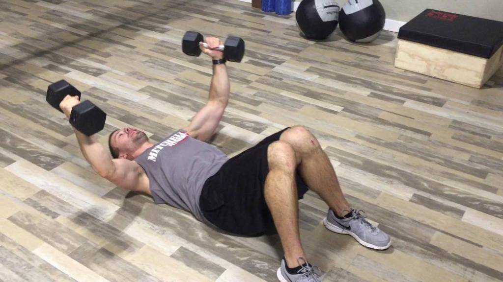 Исходное положение: возьмите гантели и ложитесь на пол, ноги должны быть согнутыми в коленях. Затем протяните кверху руки с зажатыми в них гантелями и плавно опустите их в стороны, пока они не коснутся локтями пола (на вдохе). Далее подождите 1-2 сек. и вернитесь в ИП (на выдохе)