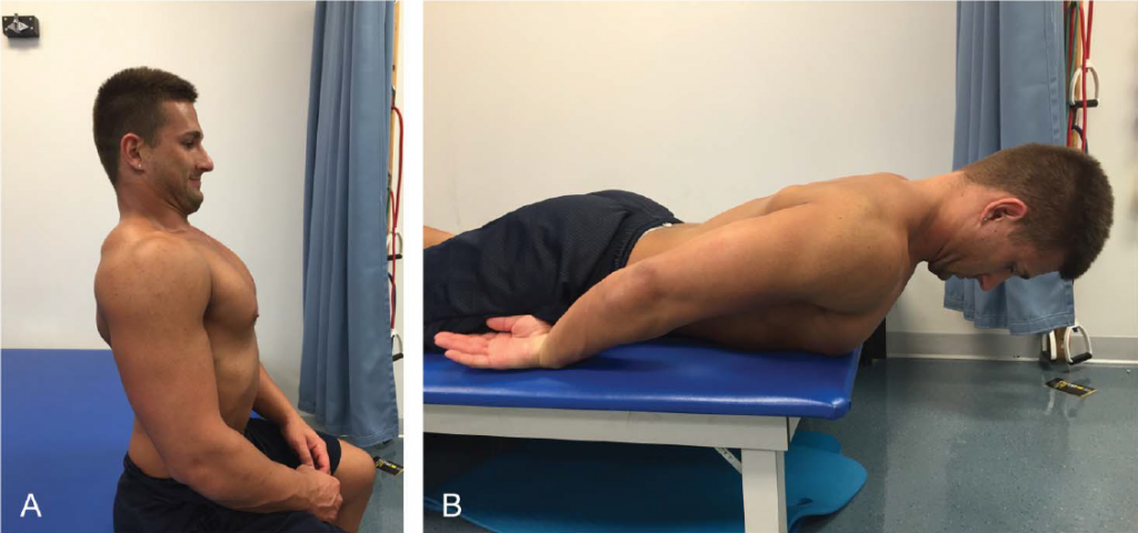 Ретракцию шеи нужно первоначально выполнять сидя, пока упражнение не будет хорошо переноситься и правильно выполняться. Для ретракции шеи клиент двигает нижнюю челюсть назад, к позвоночнику, без сгибания шеи (Рисунок 3А). После того, как освоено правильное выполнение, ретракцию можно выполнять лёжа на животе с грудной клеткой, выдвинутой над краем стола, руки вдоль тела, а лопатки в среднем положении между полным сведением и полной протракцией (Рисунок 3В). Достигнутое положение ретракции шеи поддерживается 10 с, в подходе 12 повторений. Упражнение можно усложнить, увеличив продолжительность удержания, количество повторений, а также выполнение упражнения сидя с эспандером. У людей со слабостью ГРШ проявляются компенсации, включая разгибания шеи (взгляд вверх), разгибание туловища (прогиб спины) или наклона туловища назад.