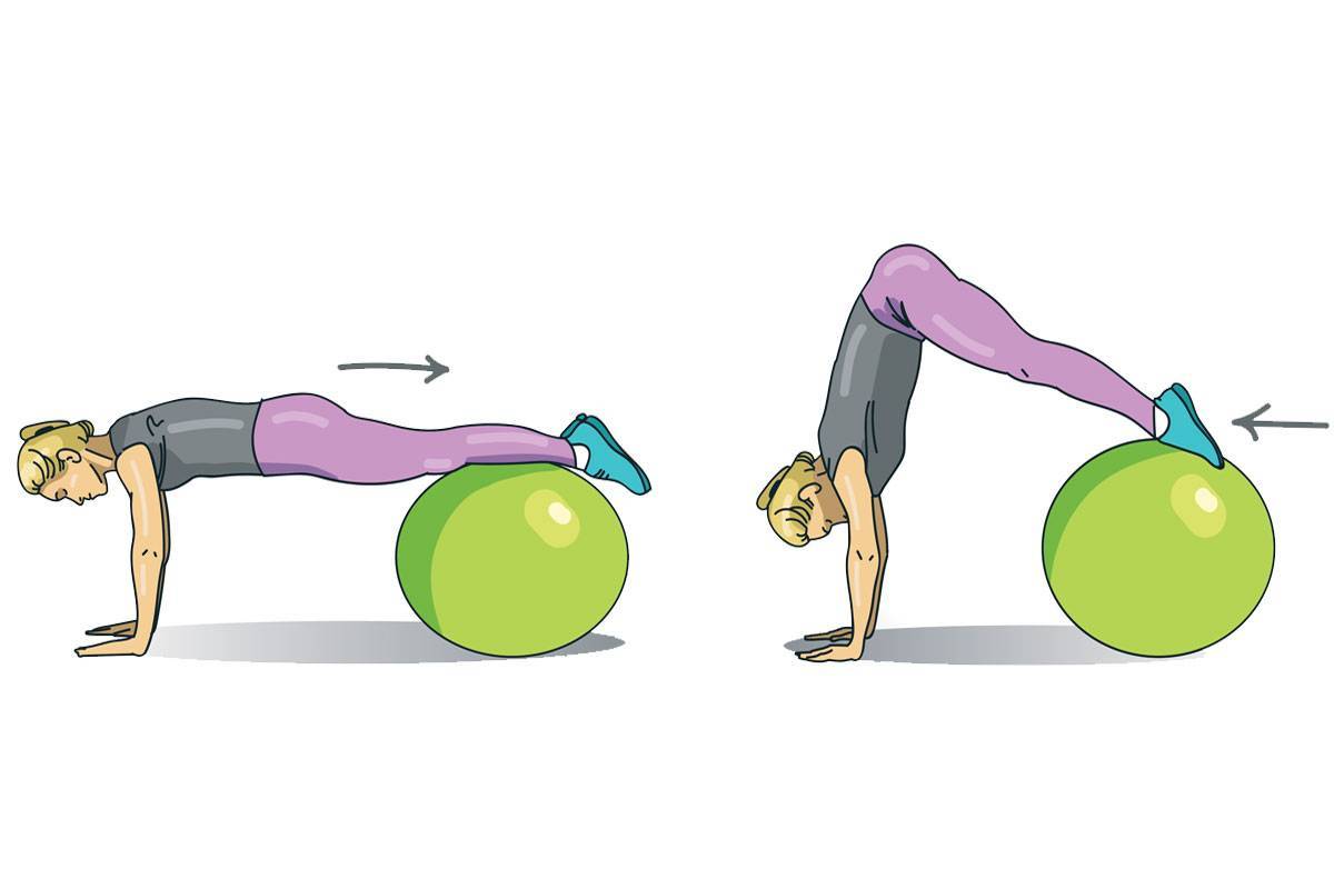 Исходное положение — руки на полу (следите за тем, чтобы нагрузка была распределена равномерно на ладонь, а кисть не заламывалась), ноги на фитболе. На выдохе, за счет активации мышц пресса, поднимите таз вверх — мяч должен подкатиться ближе к рукам.