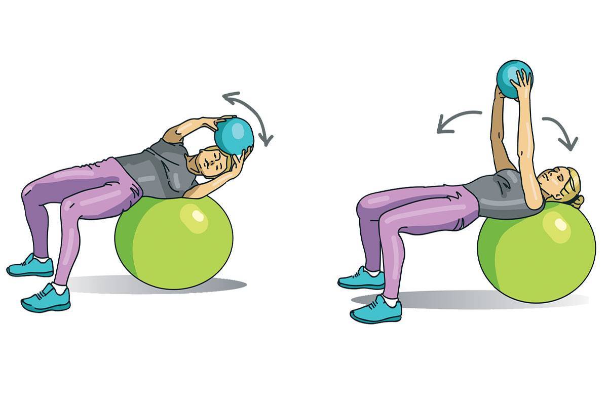 Исходное положение — лежа на спине на фитболе, ноги плотно стоят на полу. Руки вытянуты перед собой (для усложнения можно взять в руки мяч). На выдохе повернитесь в сторону, ощущая работу косых мышц пресса. Вернитесь в исходное положение и повторите для другой стороны.