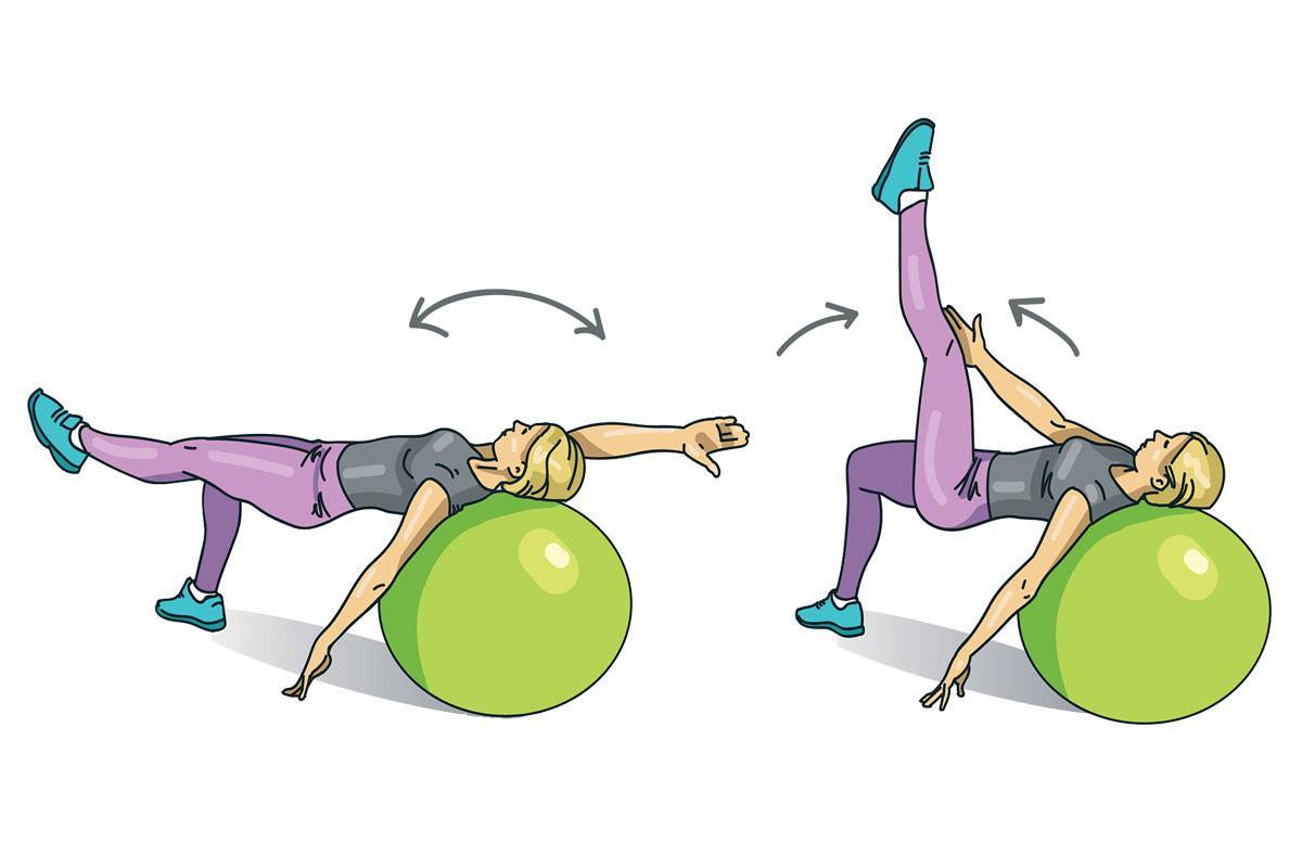 Исходное положение – лежа верхней частью спины на фитболе, правая нога согнута в колене и стоит на полу, левая вытянута вперед. Правая рука также вытянута, а левая — внизу. На выдохе поднимите левую ногу вверх, одновременно направляя правую руку к колену. Следите за ощущением работы бокового пресса.